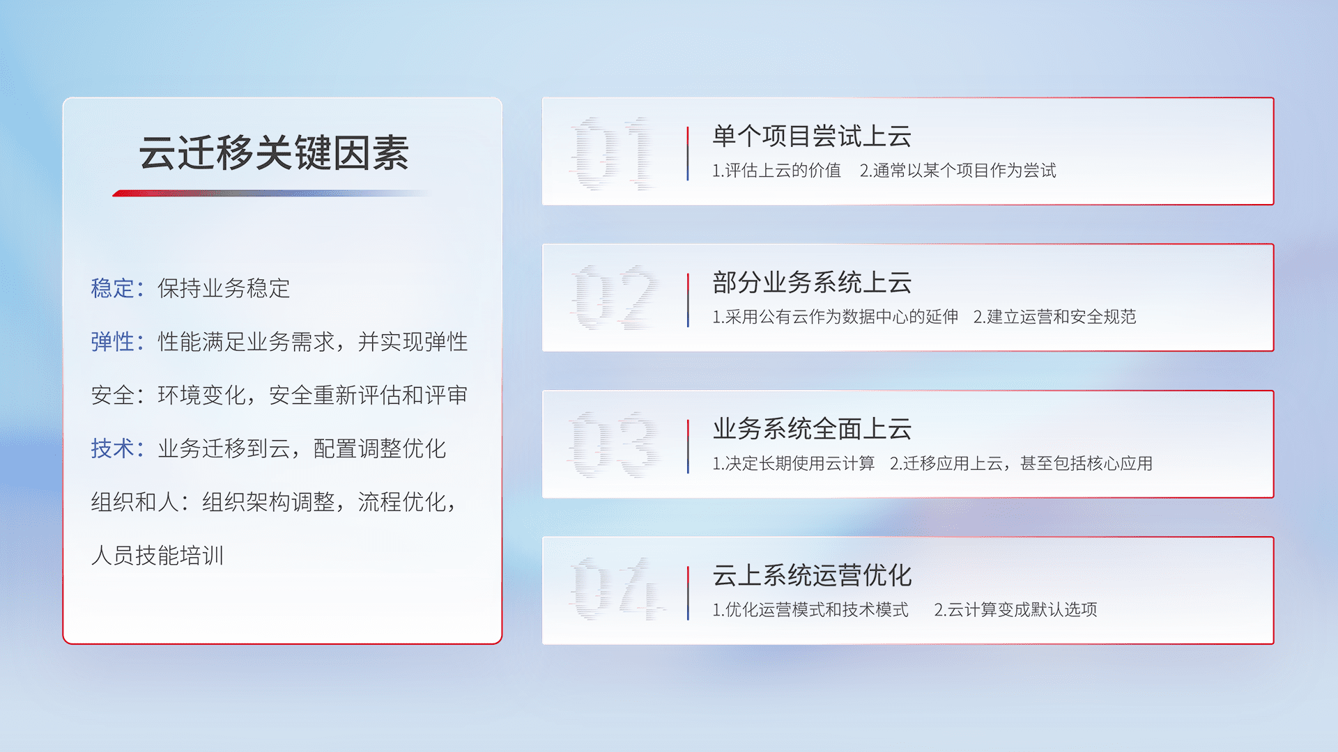 结合实际业务,,从规划设计、、、云平台选型、、云原生改造、、、、数据迁移、、、、集成交付,,,迁移全过程为客户识别最佳上云路径,,,,做好风险识别管理,,设计网络架构、、身份权限、、、安全审计合规、、、、操作审计、、、日志审计、、、监控告警策略、、、多站点容灾设计等,,对云上基础设施进行整体规划,,,,提升IT治理水平,,以满足弹性、、、高可用、、、、高性能的需求。。。。