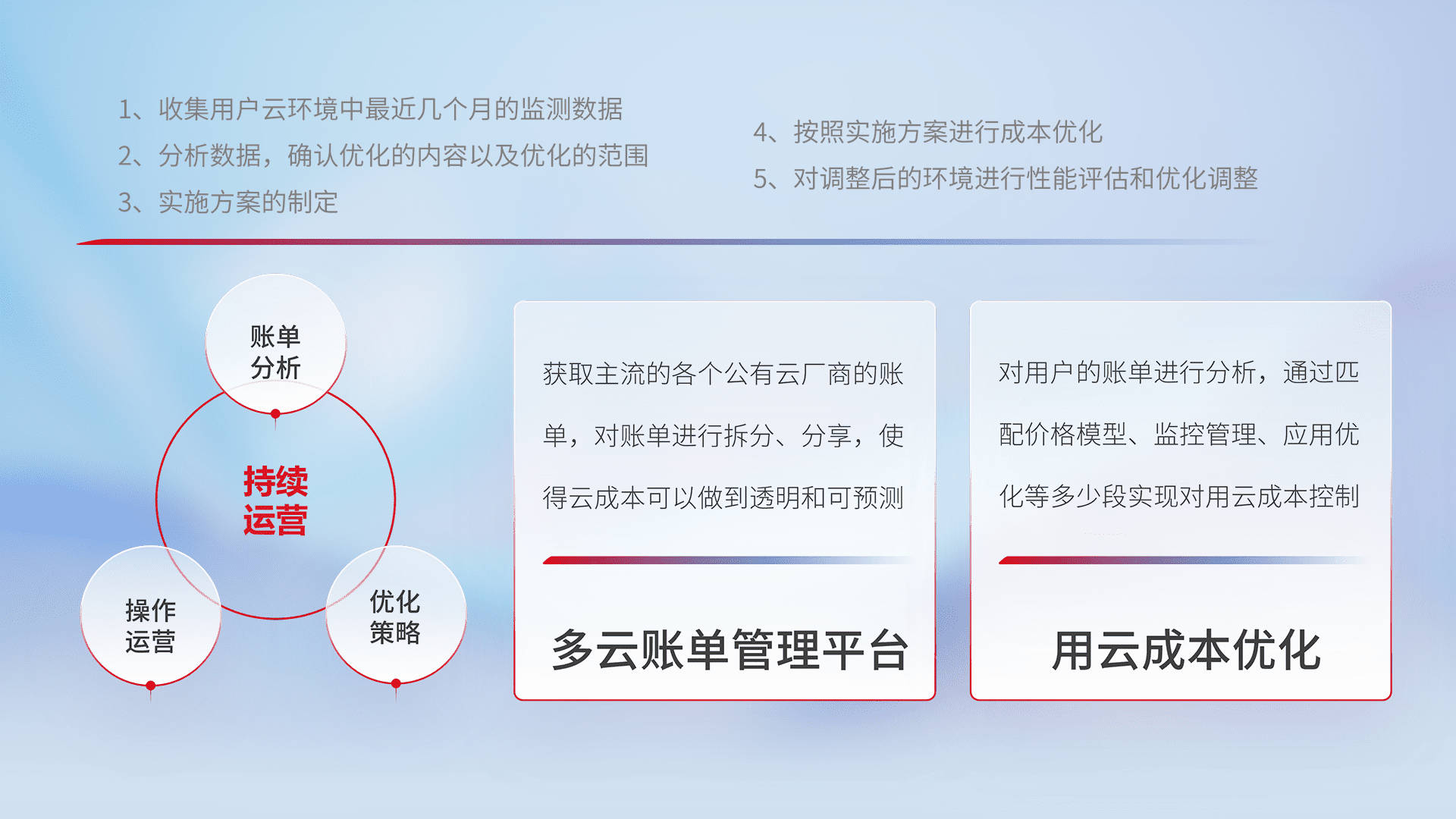 通过多云纳管,,,,以统一的资源数据模型把客户的云资源进行抽象和封装,,进而实现对多云资源的统一操作,,,保障云资源管理的可靠性、、稳定性与可用性。。。。量身定制化运维内容,,,配置、、、、开发运维、、、、补丁管理、、、备份、、、监控、、、认证和访问管理、、、审计和日常巡检等,,,保障在用云过程中的可靠度,,稳定度以及高可用率。。